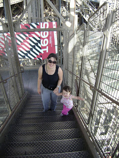 Since Wednesday would be our last day, we knew we would have to wake up early so we could go to the top of the Eiffel. After a long day of walking, walking, walking, and riding in disgustingly hot subways, the last thing you want to do is to get up early. (I must add here that Parisians do not smell so good. All that expensive perfume but lots of body odor!) But it is the Eiffel. So we arrived 15 minutes after it opened on Wednesday morning. One line was LONG, and the other was quite short. In our ignorant excitement we went to the short line. I did notice a sign that said no strollers allowed, but didn’t think anything of it – until we paid and entered the base of the Eiffel. Yep, we were not going up a nice big elevator, we were walking up stairs! The actual count of stairs includes 9 steps to the ticket booth at the base, 328 steps to the first level, 340 steps to the second level and 18 steps to the lift platform on the second level. But it felt like 1 million. Especially after walking so much the last two days. I stopped so many times. Tyler had the backpack and Isabella; I had the stroller. She walked a majority of the stairs as well. So she can brag when she gets older that when she was 18 months old she walked the Eiffel! ๐