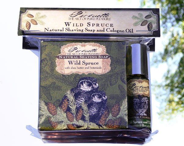 Together at last, our Wild Spruce Shaving Soap and Cologne Oil. Enjoy a fantastically clean, smooth shave for face and body with soothing kaolin clay, shea butter and organic botanicals. Finish with a dab of cologne oil on your pulse points – forest fresh wild spruce with bewitching, deep roots of smoky tobacco, leather and a wink of spice. $33.00 retail value.