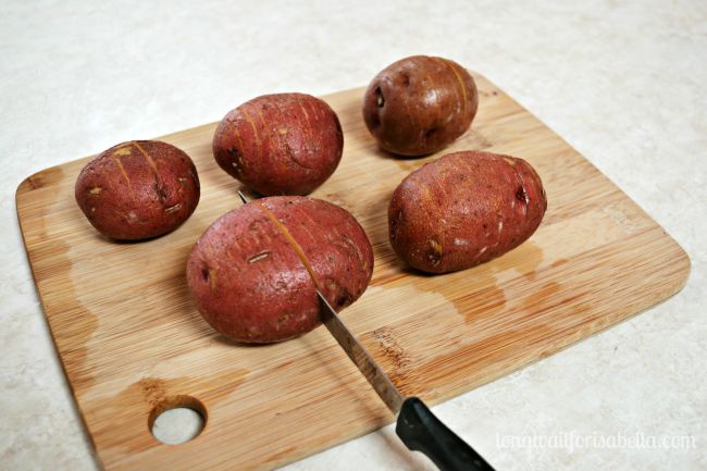 Tasteful Selections 2-bite Ruby Sensation potatoes are perfect for this recipe. Simply cut slices down the potato without going through the potato. I made it thin thinking they might come out a bit more crispy.