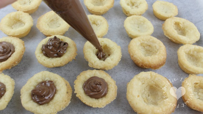 6. Pipe the hazelnut spread into each cookie cup.